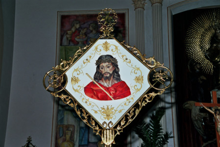 En la parte delantera lleva pintada una Santa Faz representativa del Ecce-Homo obra de Francisco Medina Martínez sobre fondo de raso blanco y rodeada con bordados de hilo de oro.
